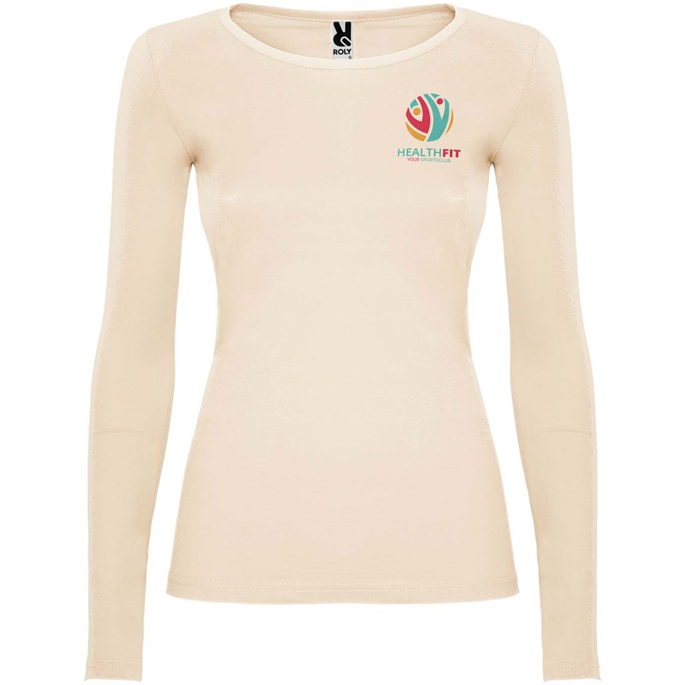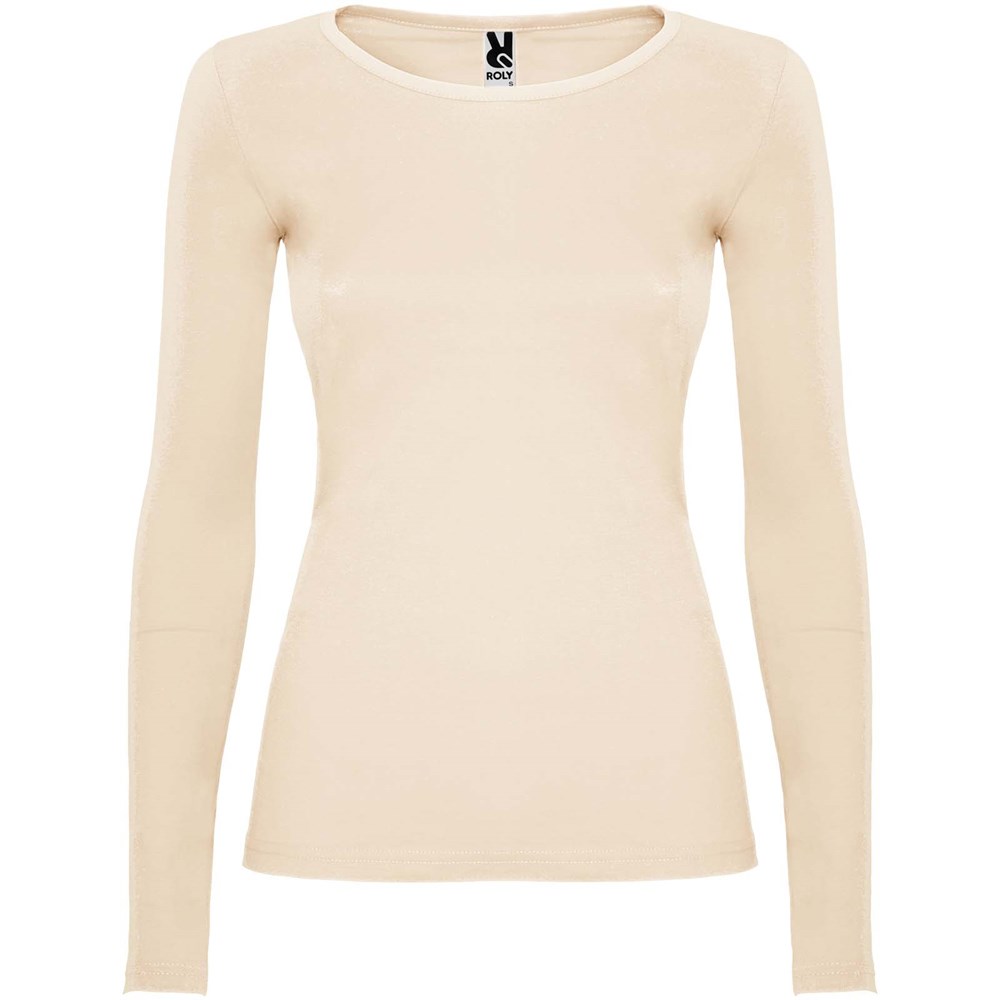 Langärmeliges, halb tailliertes T-Shirt mit feinem Halsbündchen. Keine Ärmelbündchen. Seitennähte. Herausnehmbares Etikett.
