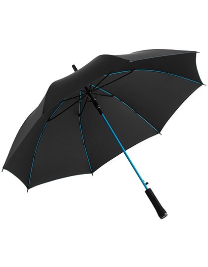 Komfortable Automatik-Funktion zum schnellen Öffnen | Windproof-Features für höhere Gestell-Flexibilität und bessere Windsicherheit | Flexible Fiberglasschienen | Stabiler Stahlstock mit farbiger Kunststoffummantelung | Bezug: 100% Polyester-Pongee (recycelt & waterSAVE®) | Dezente Verzierung des Bezugs durch farbige Nähte | Soft-Touch-Griff mit Auslösetaste und Werbeanbringungsmöglichkeit