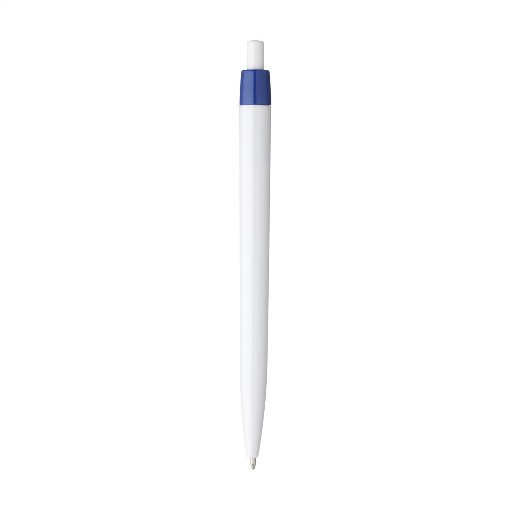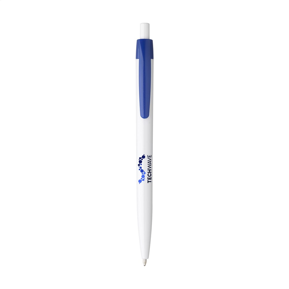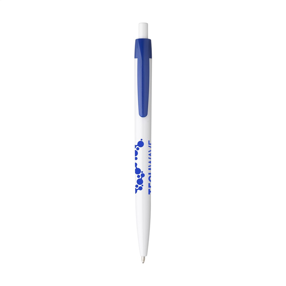 Blauschreibender Kugelschreiber mit einteiligem Gehäuse. Sehr gut geeignet für einen großzügigen Aufdruck.