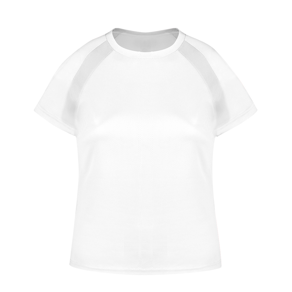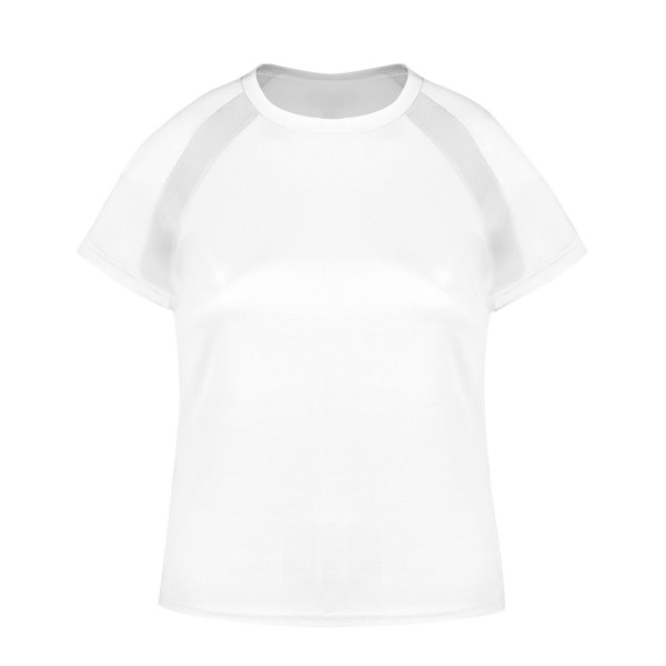 Damen-T-Shirt aus 100% atmungsaktivem Polyester mit 135g/m2. Mit Ranglan-Ärmeln, Rundhalsausschnitt und Front- und Seitenstreifen aus atmungsaktivem, mikroperforiertem Gewebe. Erhältlich in den Größen S, M, L, XL.