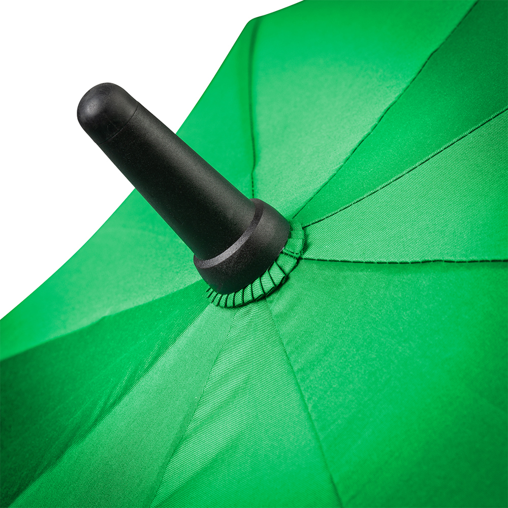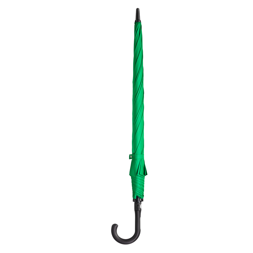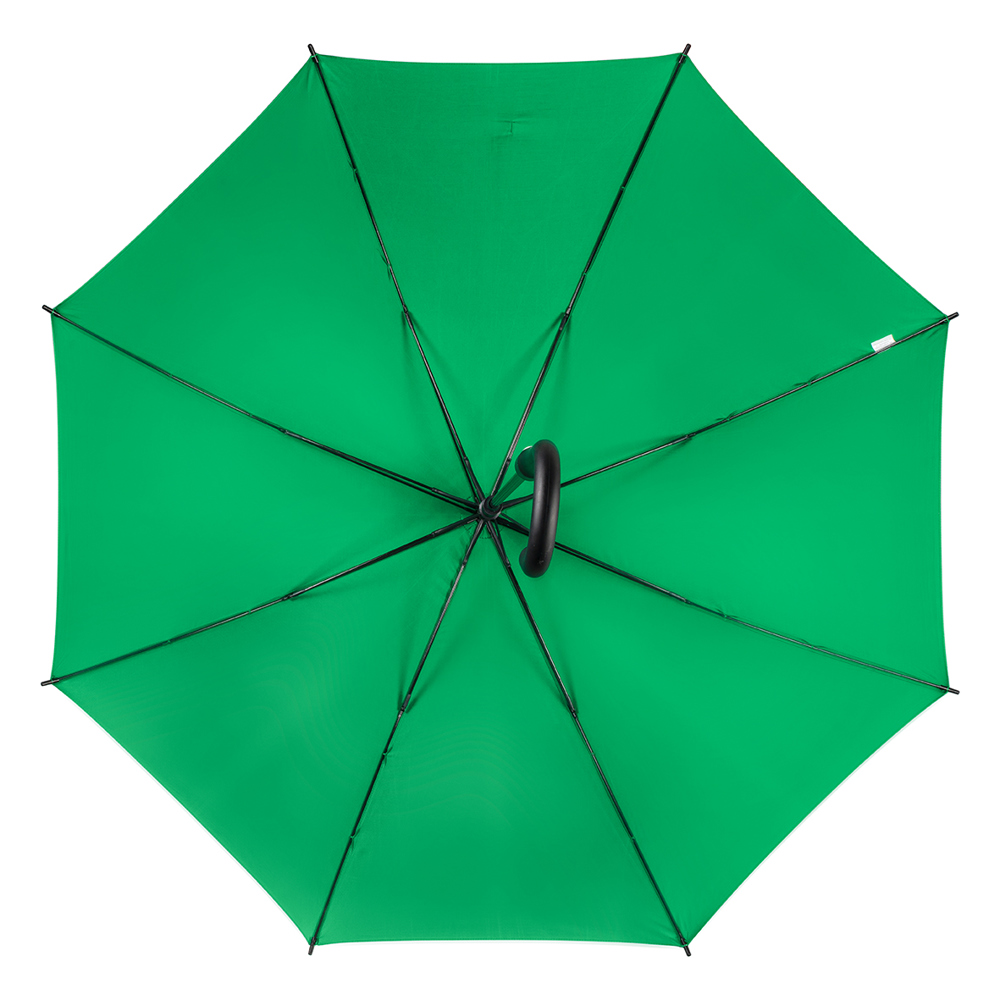 Dieser Regenschirm aus 190T RPET-Pongee hat einen Durchmesser von ca. 130 cm. Mit einer geschlossenen Länge von ca. 101 cm lässt er sich dank des Automatikmechanismus schnell öffnen. Der Schirm verfügt über 8 stabile Segmente, schwarze 65 cm lange Fiberglasspeichen und einen robusten 14 mm Fiberglasschaft. Der gebogene Rundgriff mit PU-Beschichtung in Schwarz sorgt für einen komfortablen Halt.