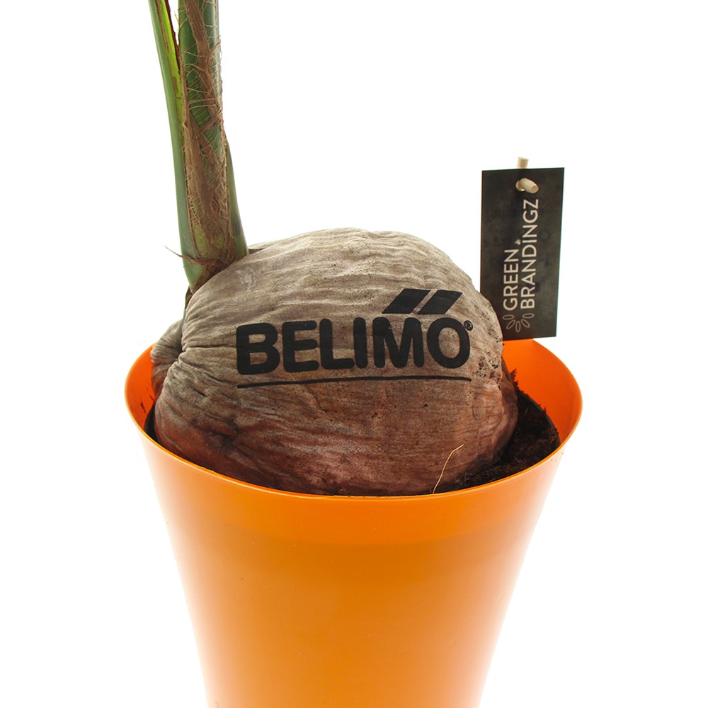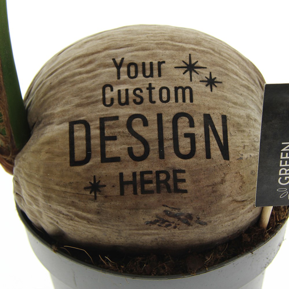 Entdecken Sie die zauberhafte Schönheit der lebendigen Kokospalm Green Brandingz®, ein wahrer Blickfang, der sofort die Aufmerksamkeit auf sich zieht. Diese Kokospalm bringt ein unwiderstehliches tropisches Gefühl sowohl ins Büro als auch nach Hause. Die imposante Kokosnuss an sich ist bereits ein auffälliges Phänomen, mit einer wunderschönen Palme, die majestätisch daraus hervorsprießt. Aber stellen Sie sich vor, wie besonders das wird, wenn Ihr eigenes Logo oder Design darauf prangt.