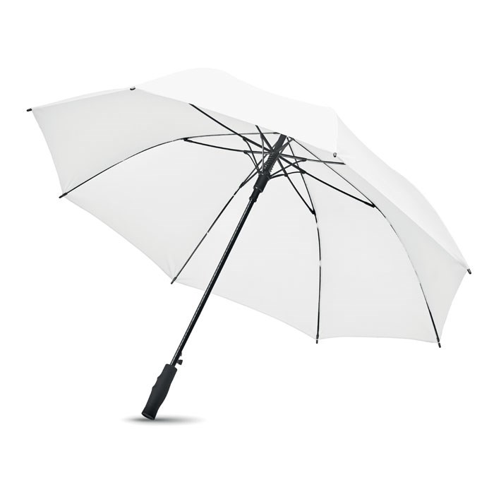 27'' Regenschirm aus 190T Pongee. Windbeständig. Stock und Stangen aus Fiberglas. Schwarze Krone und Spitzen aus Kunststoff. Schwarzer Griff aus ABS mit gummiertem Finish. Automatische Öffnung, manuelle Schließung.