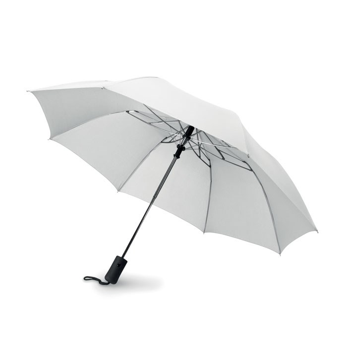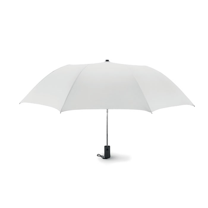 21'' Regenschirm aus 190T Seide. 2-fach faltbar. Stock, Schienen und Spitze aus verzinktem Stahl. Schwarz gummierter ABS Griff. Mit passender Schirmhülle. Automatische Öffnung, manuelle Schließung.
