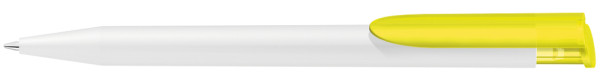 Druckkugelschreiber mit gedeckt mattem Gehäuse in weiß und farbig transparent gefrostetem Clipdrücker.