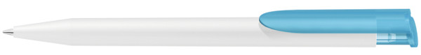 Druckkugelschreiber mit gedeckt mattem Gehäuse in weiß und farbig transparent gefrostetem Clipdrücker.