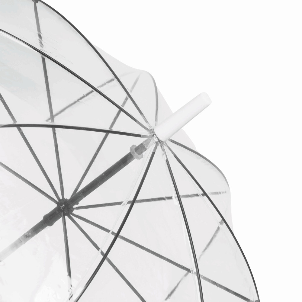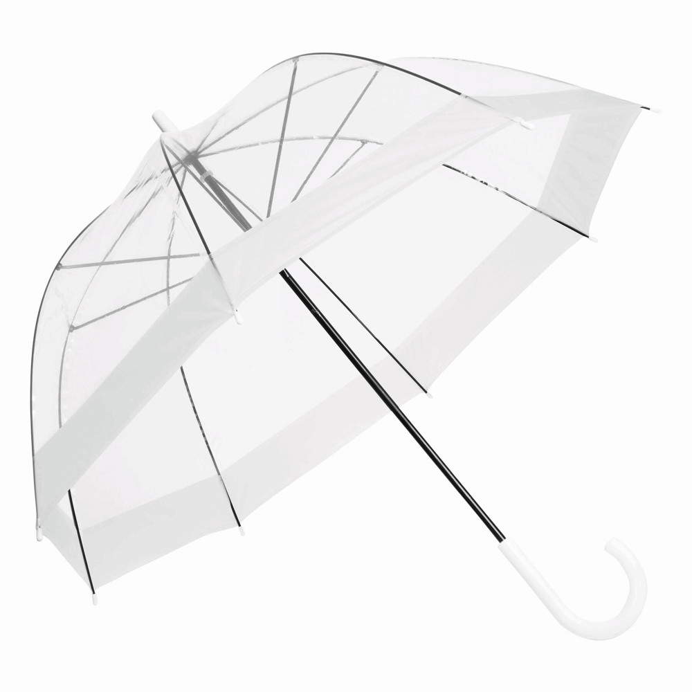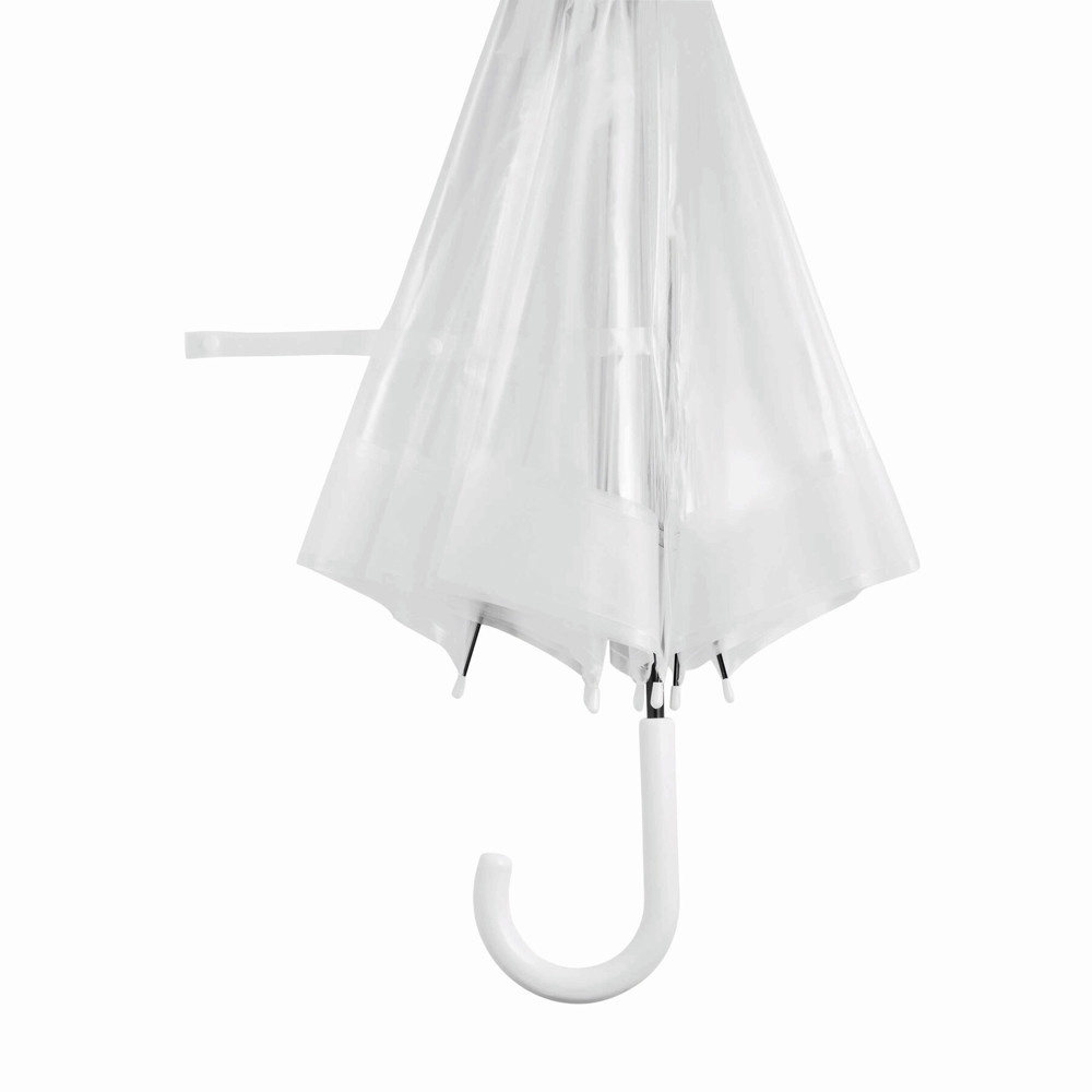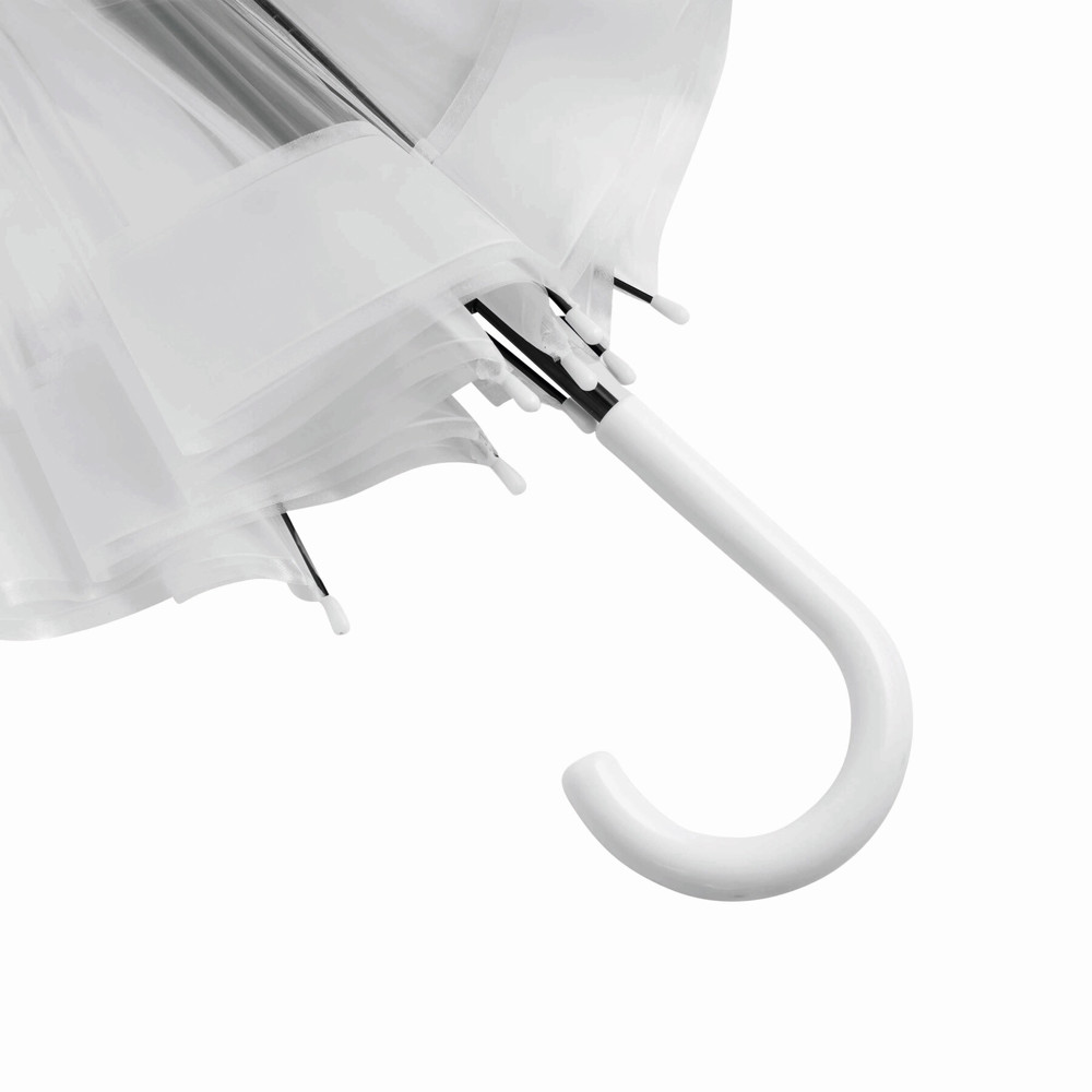 Glockenschirm HONEYMOON: Metallstock und –speichen, Kunststofftips und –spitze, Kunststoffrundhakengriff, transparente POE-Bespannung mit farbiger Bordüre, Schließband mit Druckknopf