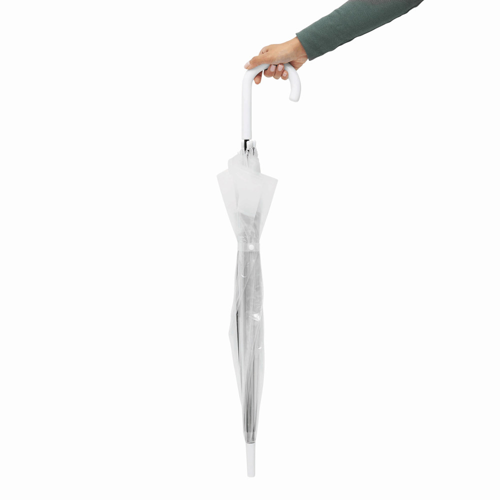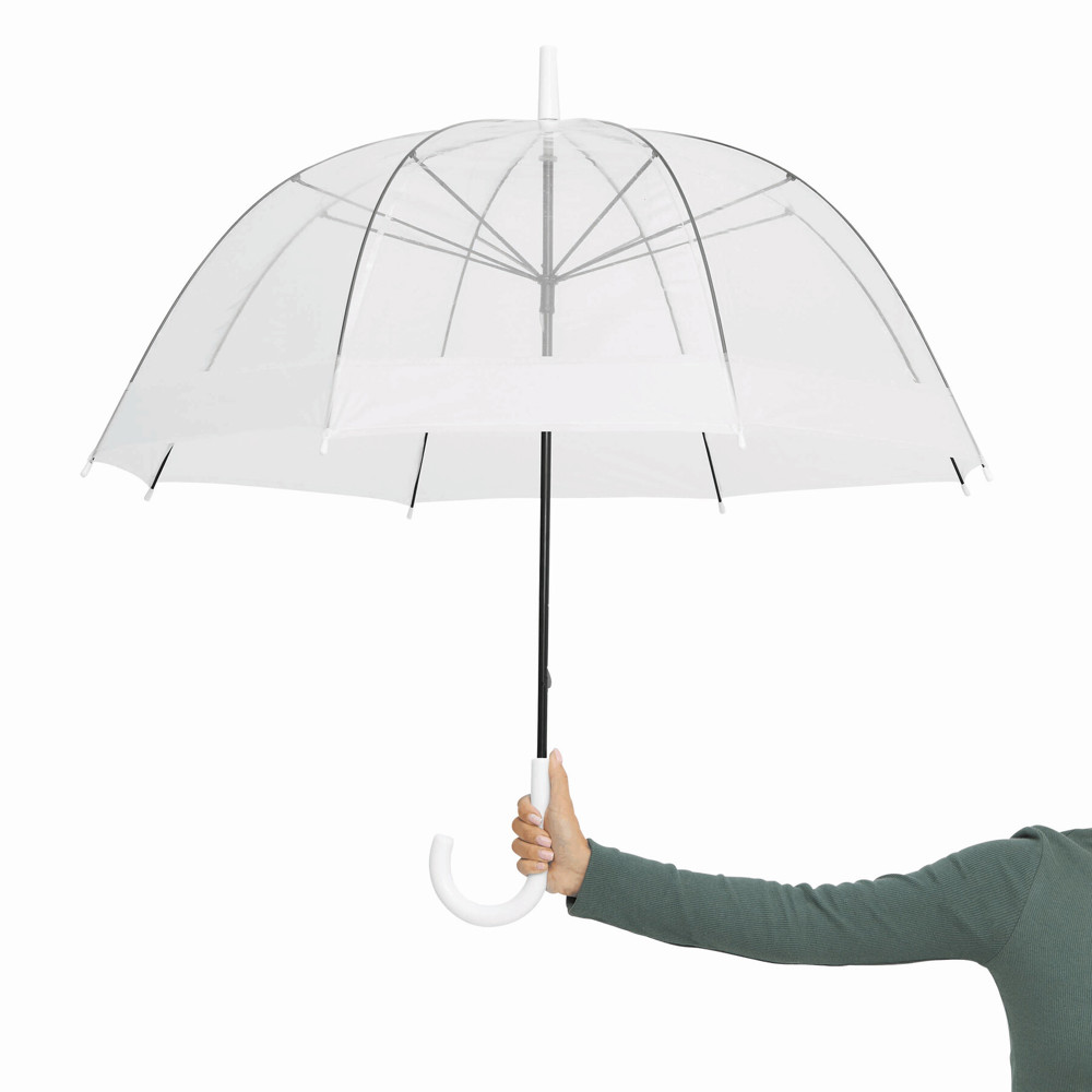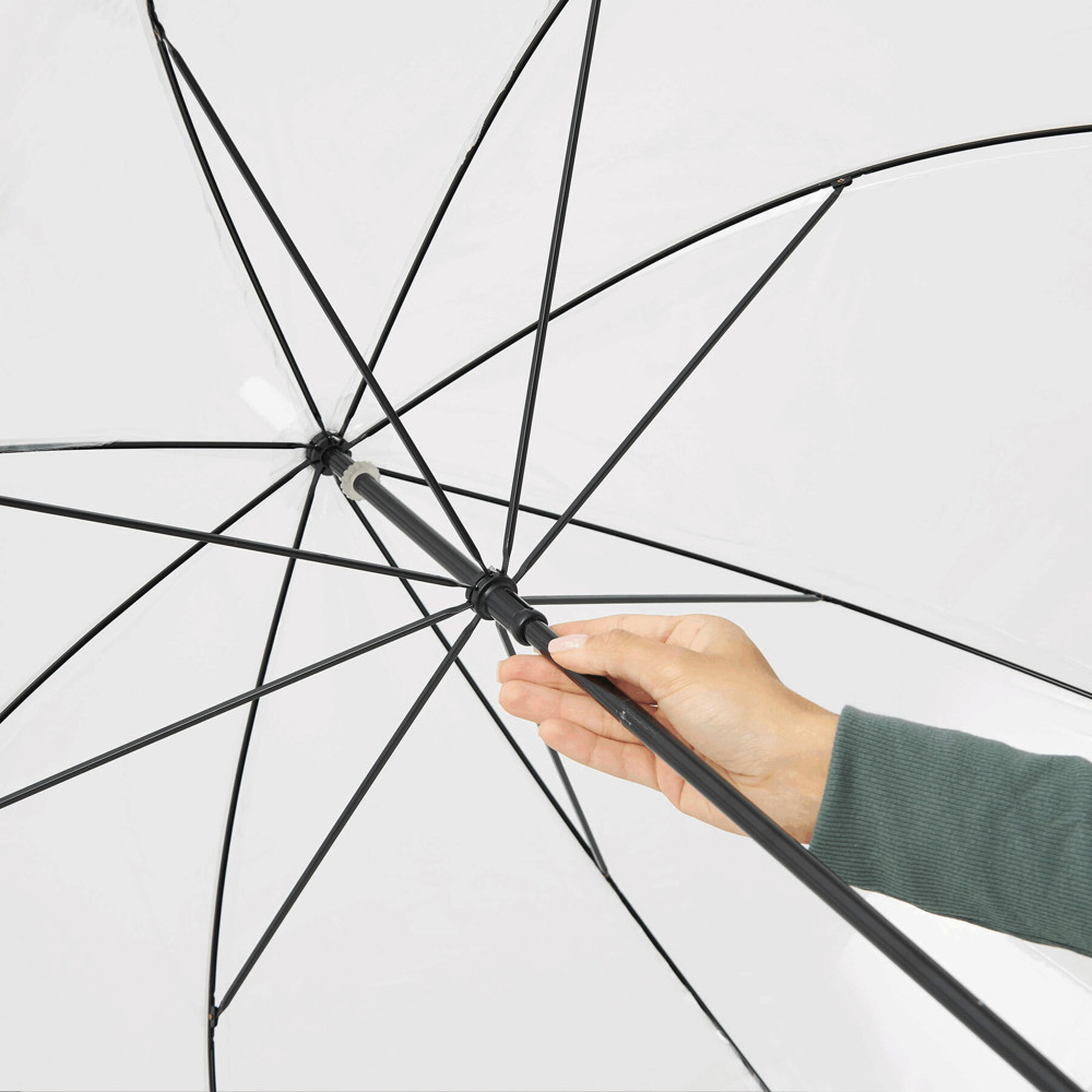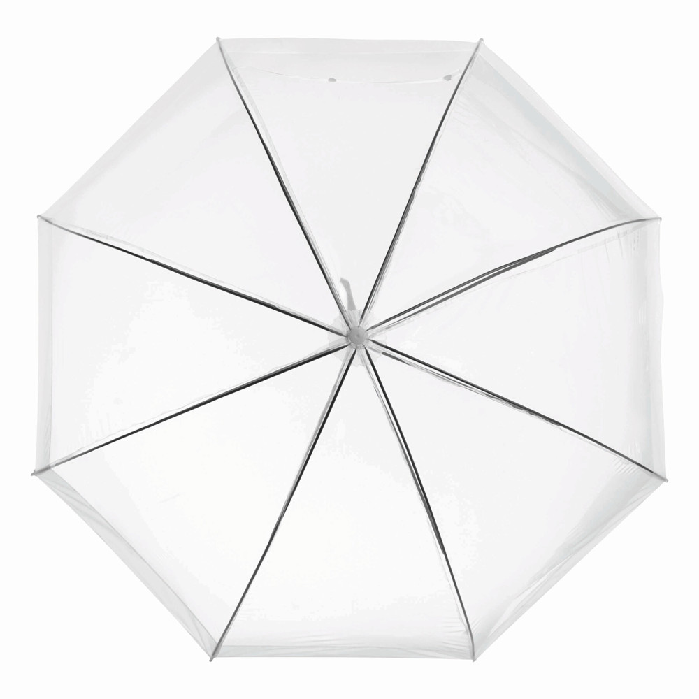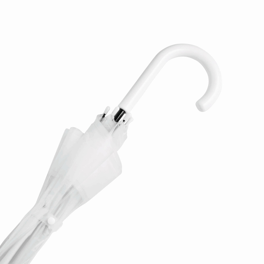 Glockenschirm HONEYMOON: Metallstock und –speichen, Kunststofftips und –spitze, Kunststoffrundhakengriff, transparente POE-Bespannung mit farbiger Bordüre, Schließband mit Druckknopf