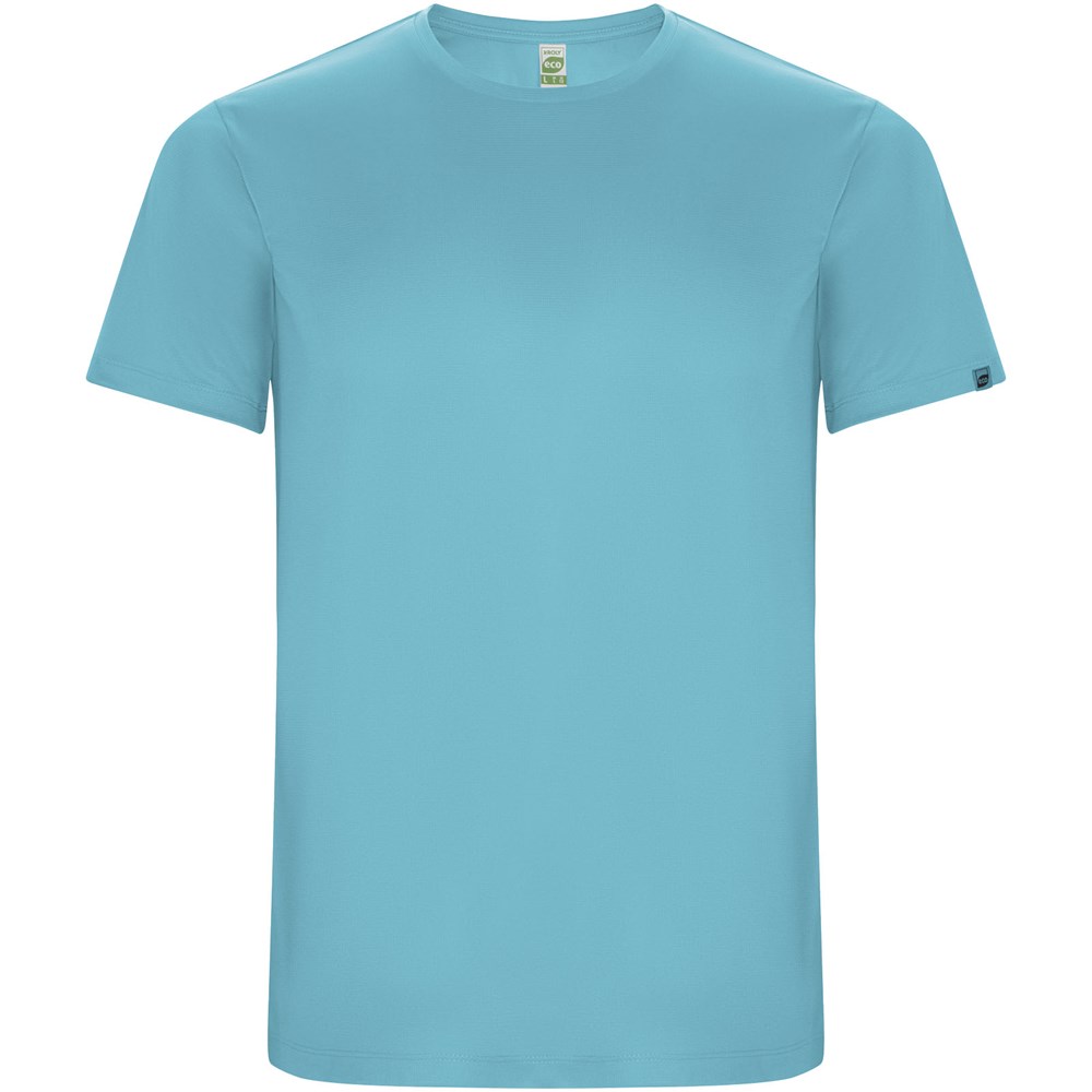 Funktions-T-Shirt aus recyceltem Polyester CONTROL DRY. Rundhalsausschnitt mit farblich abgesetzten Nähten. ECO-Logo-Etikett am Ärmel. Verpackung aus Recyclingmaterial. Herausnehmbares ECO-Etikett. Verpackung aus Recyclingmaterial. Technisches Gewebe. Das Modell ist 180 cm groß und trägt Größe M.