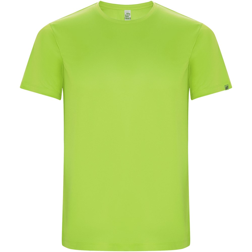 Funktions-T-Shirt aus recyceltem Polyester CONTROL DRY. Rundhalsausschnitt mit farblich abgesetzten Nähten. ECO-Logo-Etikett am Ärmel. Verpackung aus Recyclingmaterial. Herausnehmbares ECO-Etikett. Verpackung aus Recyclingmaterial. Technisches Gewebe. Das Modell ist 180 cm groß und trägt Größe M.