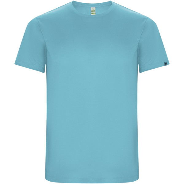 Funktions-T-Shirt aus recyceltem Polyester CONTROL DRY. Rundhalsausschnitt mit farblich abgesetzten Nähten. ECO-Logo-Etikett am Ärmel. Verpackung aus Recyclingmaterial. Herausnehmbares ECO-Etikett. Verpackung aus Recyclingmaterial. Technisches Gewebe. Das Modell ist 115 cm groß und trägt Größe 5/6.