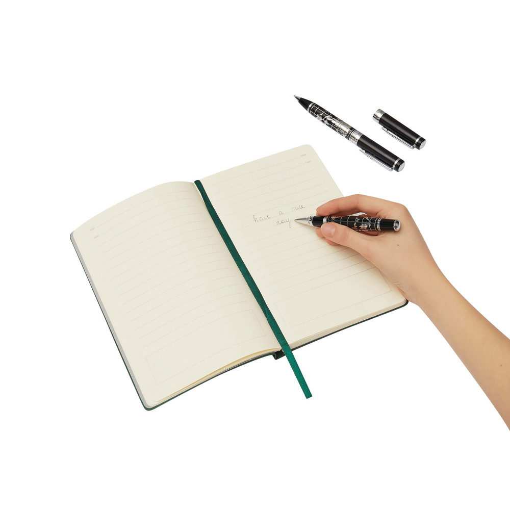 Schreibset INTERCONTINENTAL, 2-teilig: bestehend aus Kugelschreiber mit Drehmechanismus (blauschreibend) sowie Tintenroller mit Verschlusskappe mit Clip (schwarzschreibend), beide Schreibgeräte mit Metall-Schaft und chromglänzendem Weltkarten-Design, im Etui mit Aluminiumplatte