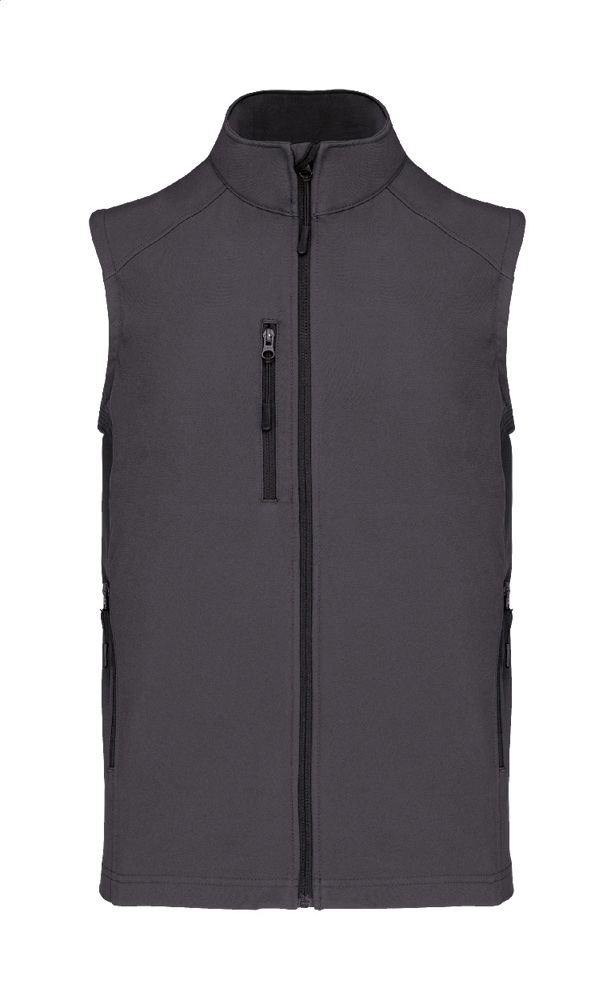 Softshell-Bodywarmer-Weste mit Reißverschluss – dreilagig, atmungsaktiv, wind- und wasserdicht – mit Reißverschluss an Brust- und Seitentaschen. Mit atmungsaktiver Zwischenschicht und innenliegendem Micro-Polar-Fleece. 95 % Polyester, 5 % Elasthan, 300 g/m². Marke: Kariban.