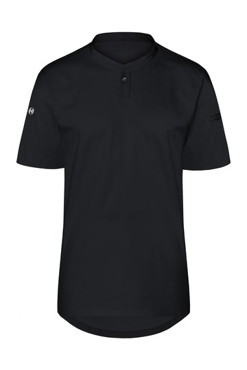Vorderseite: Köpergewebe; Rückseite: Jersey-Piqué, atmungsaktiv und feuchtigkeitsregulierend | Modernes Arbeitsshirt mit kurzen Ärmeln im sportlich edlem Look | Tailliert geschnitten | Hohe Waschbarkeit | Halsausschnitt mit schmalem Stehkragen und kleiner Knopfleiste | Leistentasche am linkem Ärmel