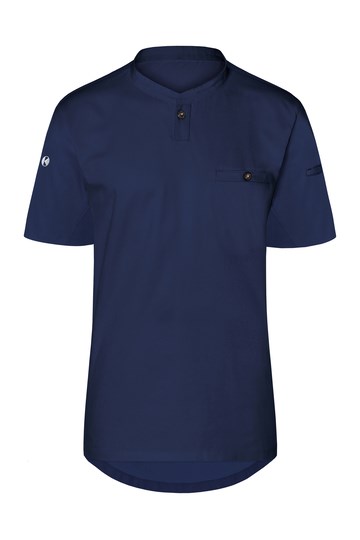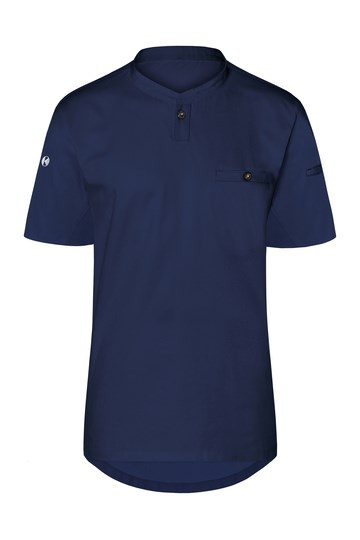 Vorderseite: Köpergewebe; Rückseite: Jersey-Piqué, atmungsaktiv und feuchtigkeitsregulierend | Modernes Arbeitsshirt mit kurzen Ärmeln im sportlich edlem Look | Tailliert geschnitten | Hohe Waschbarkeit | Halsausschnitt mit schmalem Stehkragen und kleiner Knopfleiste | Brustleistentasche mit Knopf | Leistentasche am linkem Ärmel