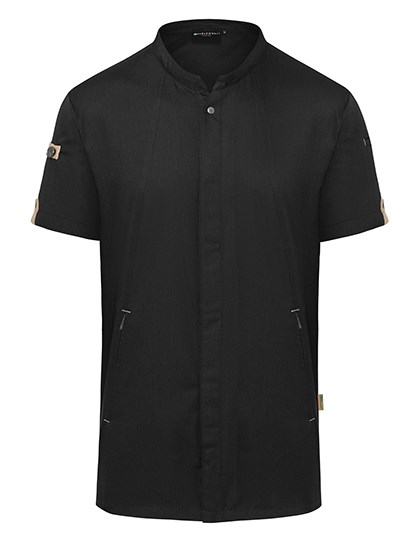 Vorderseite: Köpergewebe, 150 g/m² | Rückseite: Jersey-Piqué, 170 g/m², atmungsaktiv, feuchtigkeitsregulierend | Innovative nachhaltige Kochjacke mit kurzen Ärmeln, die urbanen Style mit natürlichem Flair verbindet | Der Artikel enthält 72% recyceltes Polyester und wurde umweltverträglich und sozial verantwortlich produziert | Leicht tailliert geschnitten | Rückeneinsatz aus Jersey-Piqué sorgt für angenehme Belüftung und erhöhte Bewegungsfreiheit | mit Druckknöpfen zum schnellen Öffnen und Schließen | Vorderteil mit Reißverschlußtaschen und Leistentasche am linken Ärmel | stylische Applikationen aus Kontrastbändern an den Ärmeln und im Nacken für eine urbane Optik | Grüner Knopf zertifiziert, www.g-k.eu/karlowsky