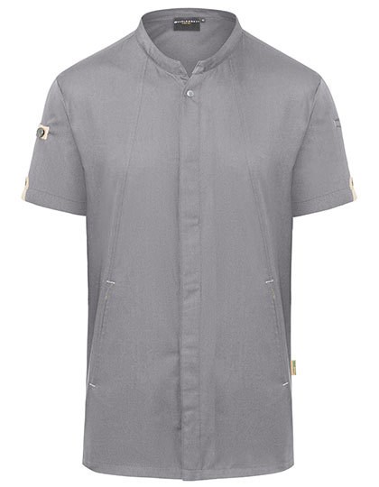 Vorderseite: Köpergewebe, 150 g/m² | Rückseite: Jersey-Piqué, 170 g/m², atmungsaktiv, feuchtigkeitsregulierend | Innovative nachhaltige Kochjacke mit kurzen Ärmeln, die urbanen Style mit natürlichem Flair verbindet | Der Artikel enthält 72% recyceltes Polyester und wurde umweltverträglich und sozial verantwortlich produziert | Leicht tailliert geschnitten | Rückeneinsatz aus Jersey-Piqué sorgt für angenehme Belüftung und erhöhte Bewegungsfreiheit | mit Druckknöpfen zum schnellen Öffnen und Schließen | Vorderteil mit Reißverschlußtaschen und Leistentasche am linken Ärmel | stylische Applikationen aus Kontrastbändern an den Ärmeln und im Nacken für eine urbane Optik | Grüner Knopf zertifiziert, www.g-k.eu/karlowsky