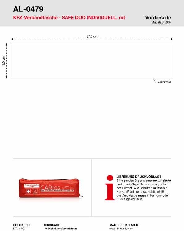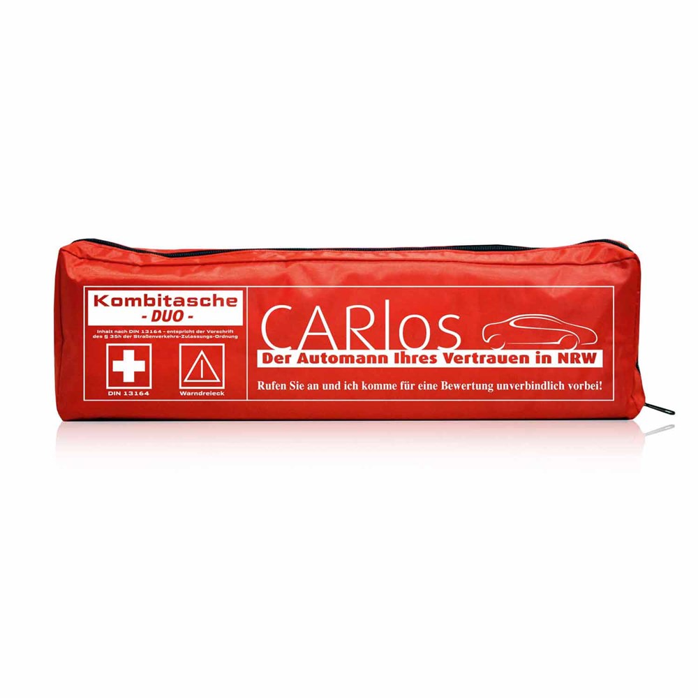 Unsere Kfz-Verbandstasche Safe Duo mit individuellem Motiv ist gefüllt mit Verbandsstoffen nach neuester DIN 13164:2022-02 und einem Euro-Warndreieck, verpackt in einer Nylontasche mit Reißverschluss. Die Rückseite ist mit einem Klettband versehen. Durch den individuellen Druck erhält jede Tasche einen zusätzlichen Reiz. Die Preise verstehen sich inkl. einem 1c-Druck und Drucknebenkosten (Film- und Druckvorkosten).