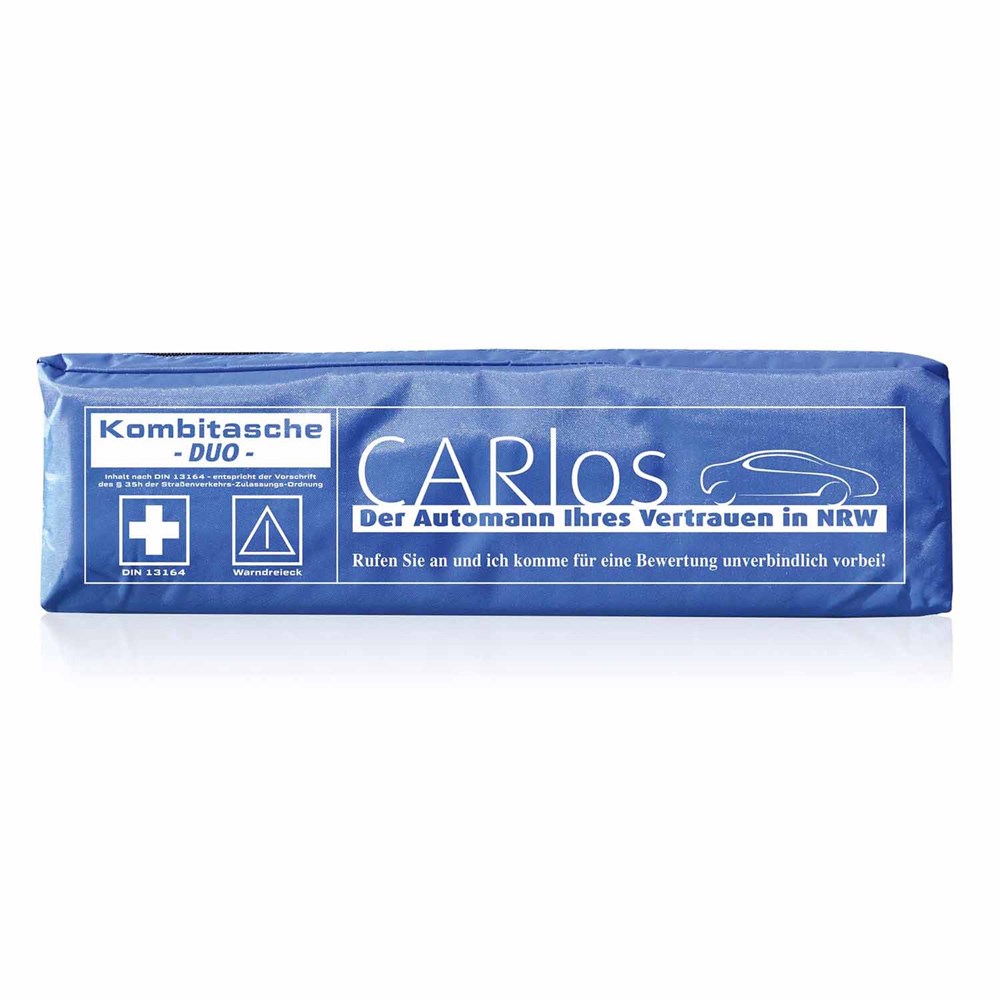 Unsere Kfz-Verbandstasche Safe Duo mit individuellem Motiv ist gefüllt mit Verbandsstoffen nach neuester DIN 13164:2022-02 und einem Euro-Warndreieck, verpackt in einer Nylontasche mit Reißverschluss. Die Rückseite ist mit einem Klettband versehen. Durch den individuellen Druck erhält jede Tasche einen zusätzlichen Reiz. Die Preise verstehen sich inkl. einem 1c-Druck und Drucknebenkosten (Film- und Druckvorkosten).