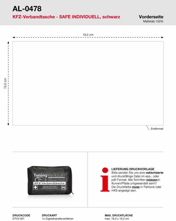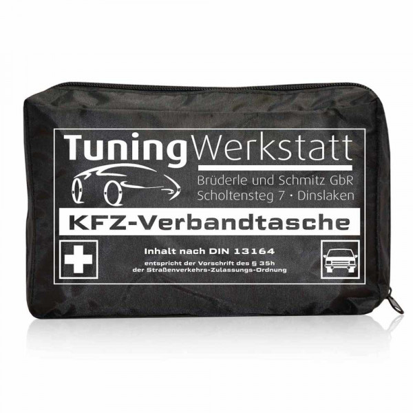 Unsere Kfz-Verbandstasche Safe mit individuellem Motiv ist gefüllt mit Verbandstoffen nach neuester DIN 13164:2022-02 (inkl. 2 medizinischer OP-Masken), verpackt in einer Nylontasche mit Reißverschluss. Durch den individuellen Druck erhält jede Tasche einen zusätzlichen Reiz.