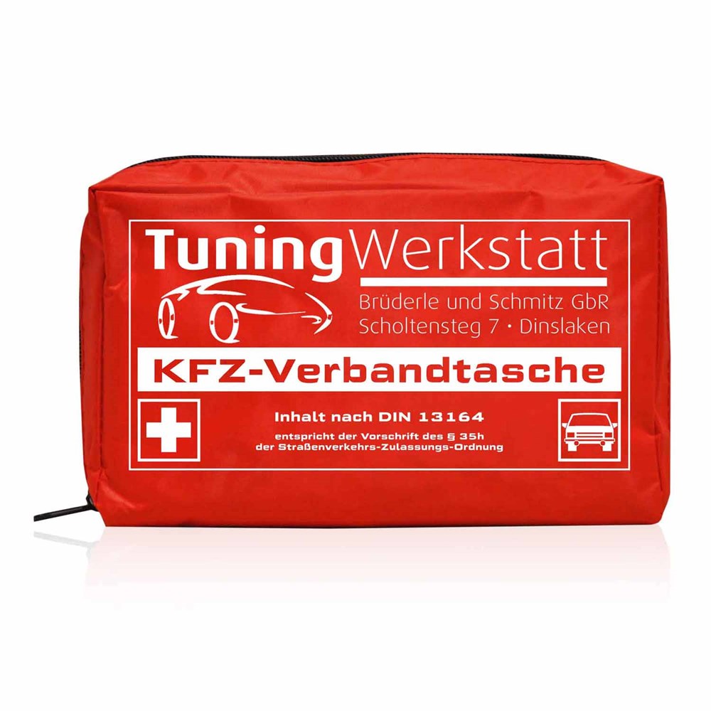 Unsere Kfz-Verbandstasche Safe mit individuellem Motiv ist gefüllt mit Verbandstoffen nach neuester DIN 13164:2022-02 (inkl. 2 medizinischer OP-Masken), verpackt in einer Nylontasche mit Reißverschluss. Durch den individuellen Druck erhält jede Tasche einen zusätzlichen Reiz.