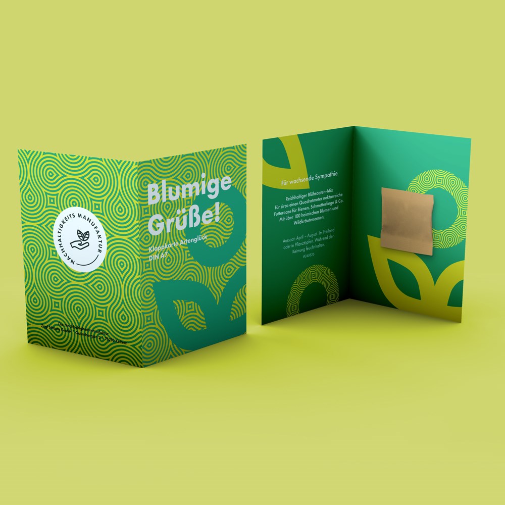 Die Klappkarte „Artenglück“ im Format A6 verbindet persönliche Wertschätzung mit einem natürlichen Erlebnis, das weiterwächst. Gefertigt aus recyceltem Karton und ausgestattet mit einem integrierten Samenbeutel, wird aus einer klassischen Grußkarte ein nachhaltiger Werbeartikel mit echtem Mehrwert. Je nach Variante enthält die Karte Basilikum, Petersilie, Dill, Sonnenblumen oder einen Blühwiesen-Samenmix und steht damit gleichermaßen für Genuss, Wachstum und Artenvielfalt. Die Klappkarte bietet viel Raum für individuelle Gestaltung im Corporate Design, alternativ stehen auch unsere liebevoll gestalteten Standardmotive zur Auswahl. Durch ihr handliches Format eignet sie sich ideal für Mailings, Kundengeschenke, Events, Messen, Nachhaltigkeitskampagnen und Mitarbeiteraktionen und transportiert die Botschaft von Verantwortung und Wertschätzung auf besonders sympathische Weise.