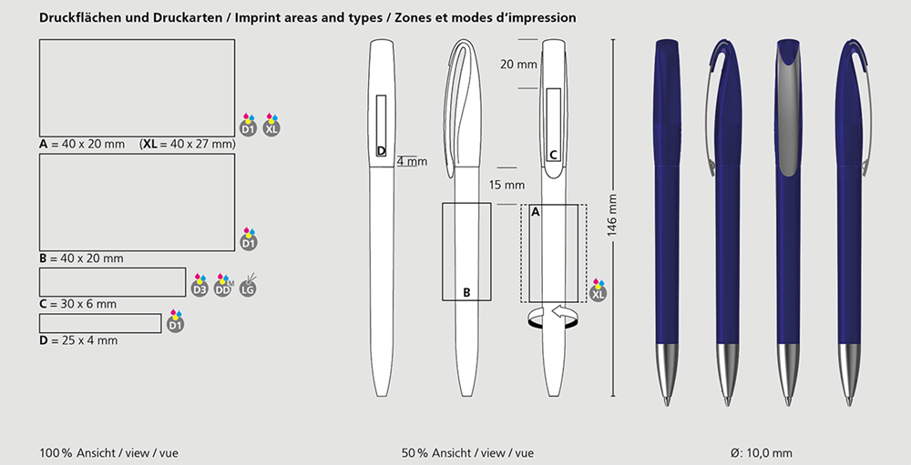 Der Boa ice/transparent MMs ist ein Drehkugelschreiber. Materialien und Oberflächen: Spitze: Messing mattverchromt. Schaft und Oberteil: Kunststoff (M-ABS) gefrostet, Oberteil: Mix aus matten und glänzenden Flächen. Klipp: Federstahl mattverchromt. Minenröhrchen: Recyceltes Polypropylen (rPP). Standardfarben: Schaft und Oberteil: aus 12 Farben kombinierbar. Sonderfarben: ab 5.000 Stück, ab 25.000 Stück ohne PMS-Zuschlag. Standardmine: Silktech L (3.000 m), blau oder schwarz, Mine optional: Silktech XL, Multifill P, Multi-Gel.