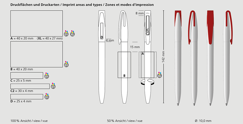 Der Cobra high gloss ist ein Drehkugelschreiber. Materialien und Oberflächen: Schaft, Oberteil und Klipp: Kunststoff (ABS) hochglänzend. Minenröhrchen: Recyceltes Polypropylen (rPP). Standardfarben: Schaft, Oberteil und Klipp: aus 14 Farben kombinierbar. Sonderfarben: ab 5.000 Stück, ab 25.000 Stück ohne PMS-Zuschlag. Standardmine: Silktech L (3.000 m), blau oder schwarz, Mine optional: Silktech XL, Multifill P, Multi-Gel.