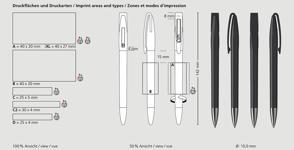 Der Cobra high gloss Mn ist ein Drehkugelschreiber. Materialien und Oberflächen: Spitze: Messing vernickelt. Schaft, Oberteil und Klipp: Kunststoff (ABS) hochglänzend. Minenröhrchen: Recyceltes Polypropylen (rPP). Standardfarben: Schaft, Oberteil und Klipp: aus 14 Farben kombinierbar. Sonderfarben: ab 5.000 Stück, ab 25.000 Stück ohne PMS-Zuschlag. Standardmine: Silktech L (3.000 m), blau oder schwarz, Mine optional: Silktech XL, Multifill P, Multi-Gel.
