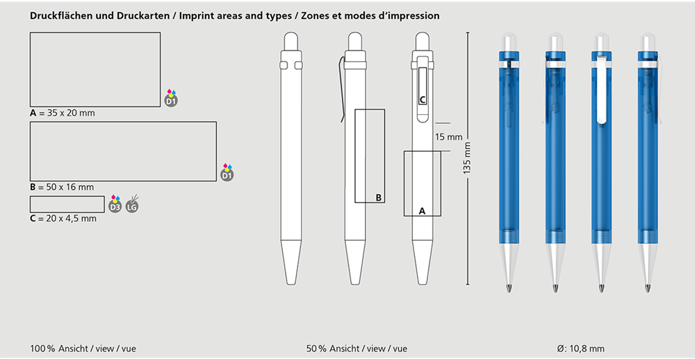 Der Icy ice MMs ist ein Druckkugelschreiber. Materialien und Oberflächen: Spitze: Messing mattverchromt. Schaft: Kunststoff (M-ABS) gefrostet. Klipp: Federstahl mattverchromt. Drücker: Messing mattverchromt. Standardfarben: Schaft: in 4 Farben erhältlich. Sonderfarben: ab 10.000 Stück, ab 25.000 Stück ohne PMS-Zuschlag. Standardmine: Icefill (2.000 m), blau, Mine optional: Silktech L.