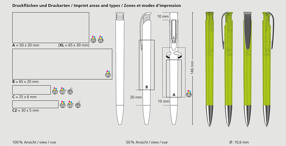 Der Jona ice MMs ist ein Druckkugelschreiber. Materialien und Oberflächen: Spitze: Messing mattverchromt. Schaft und Drücker: Kunststoff (M-ABS) gefrostet. Klipp: Federstahl mattverchromt. Minenröhrchen: Recyceltes Polypropylen (rPP). Standardfarben: Schaft und Drücker: aus 12 Farben kombinierbar. Sonderfarben: ab 5.000 Stück, ab 25.000 Stück ohne PMS-Zuschlag. Standardmine: Silktech L (3.000 m), blau oder schwarz, Mine optional: Silktech XL, Multifill P, Multi-Gel.