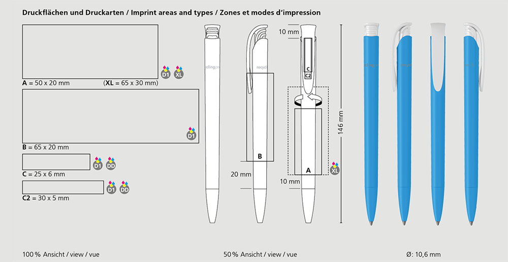 Der Jona matt recycling ist ein Druckkugelschreiber. Materialien und Oberflächen: Spitze, Schaft und Drückerklipp: Kunststoff (rABS) matt, recycelt. Minenröhrchen: Recyceltes Polypropylen (rPP). Standardfarben: Spitze, Schaft und Drückerklipp: aus 14 Farben kombinierbar. Hinweis: Aufgrund der recycelten Rohstoffe kann es zu Farbabweichungen auch bei einzelnen Bauteilen eines Produktes kommen. Sonderfarben: ab 5.000 Stück, ab 25.000 Stück ohne PMS-Zuschlag. Standardmine: Silktech L (3.000 m), blau oder schwarz, Mine optional: Silktech XL, Multifill P, Multi-Gel.