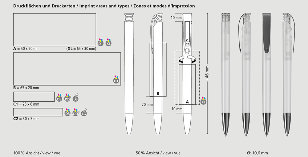 Der Jona transparent MMn ist ein Druckkugelschreiber. Materialien und Oberflächen: Spitze: Messing vernickelt. Schaft und Drücker: Kunststoff (M-ABS) transparent. Klipp: Federstahl vernickelt. Minenröhrchen: Recyceltes Polypropylen (rPP). Standardfarben: Schaft und Drücker: aus 12 Farben kombinierbar. Sonderfarben: ab 5.000 Stück, ab 25.000 Stück ohne PMS-Zuschlag. Standardmine: Silktech L (3.000 m), blau oder schwarz, Mine optional: Silktech XL, Multifill P, Multi-Gel.
