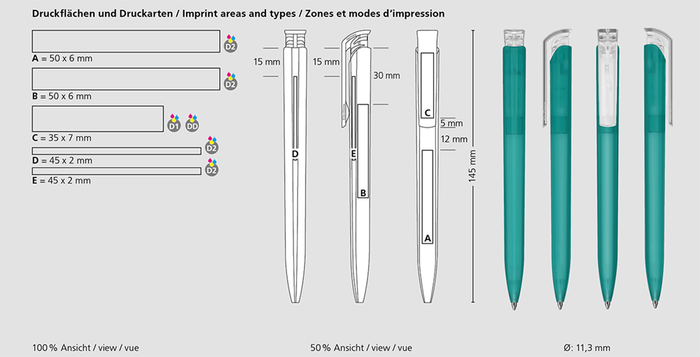 Der Trias softfrost/transparent ist ein Druckkugelschreiber. Materialien und Oberflächen: Schaft: Kunststoff (M-ABS) transparent, gummierte Softfrost-Oberfläche. Drückerklipp: Kunststoff (M-ABS) transparent. Minenröhrchen: Recyceltes Polypropylen (rPP). Standardfarben: Schaft: aus 12 Farben kombinierbar. Drückerklipp: aus 12 Farben kombinierbar. Sonderfarben: ab 5.000 Stück, ab 25.000 Stück ohne PMS-Zuschlag. Standardmine: Silktech L (3.000 m), blau oder schwarz, Mine optional: