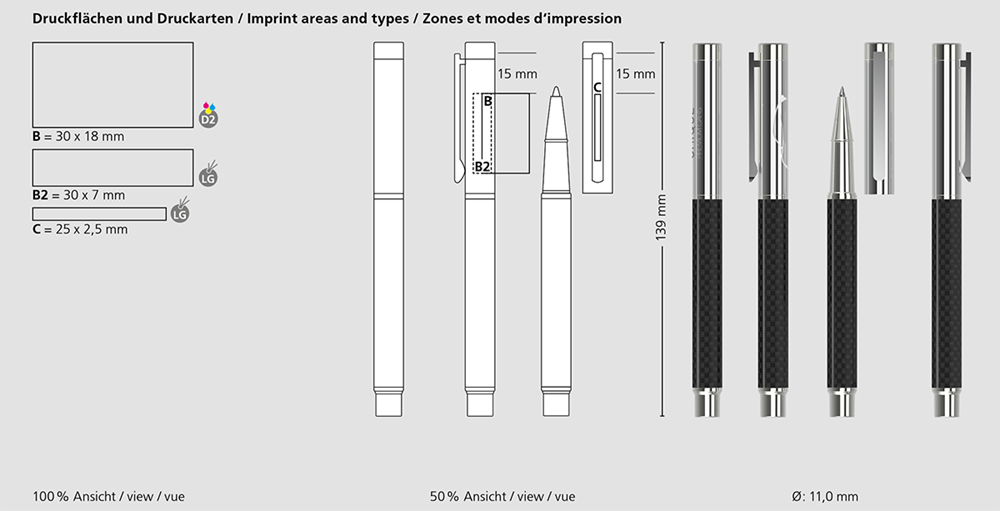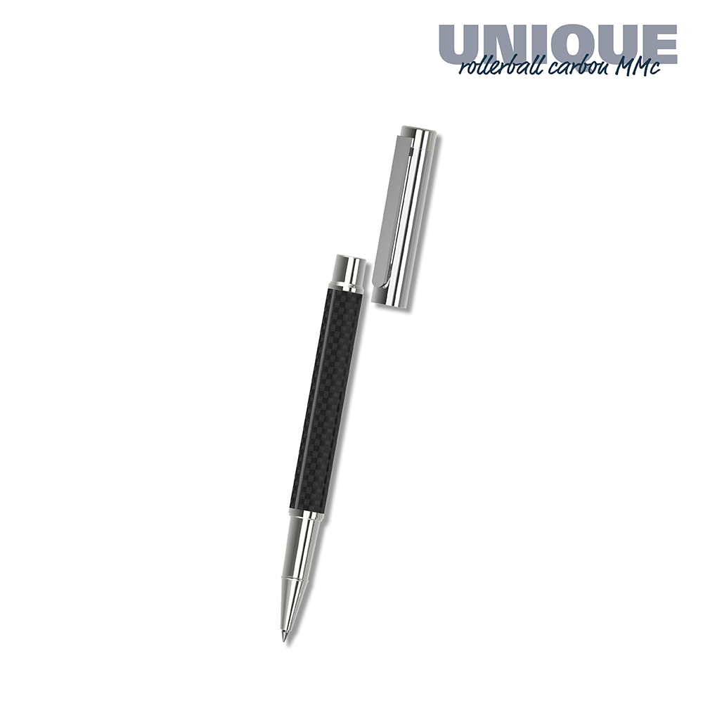 Der Unique rollerball carbon MMc ist ein Tintenroller. Materialien und Oberflächen: Spitze: Messing glanzverchromt. Schaft: Carbon. Kappe: Messing glanzverchromt. Klipp: Stahl glanzverchromt. Standardfarben: Schaft: Carbon. Sonderfarben: - Standardmine: Rollerballmine RO-S (600 - 800 m), blau oder schwarz, Mine optional: