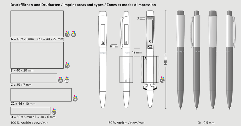 Der Zeno recycling ist ein Druckkugelschreiber. Materialien und Oberflächen: Spitze, Schaft, Oberteil und Drücker: Kunststoff (rABS) hochglänzend, recycelt. Minenröhrchen: Recyceltes Polypropylen (rPP). Standardfarben: Spitze, Schaft, Oberteil und Drücker: aus 14 Farben kombinierbar. Hinweis: Aufgrund der recycelten Rohstoffe kann es zu Farbabweichungen auch bei einzelnen Bauteilen eines Produktes kommen. Sonderfarben: ab 3.000 Stück, ab 25.000 Stück ohne PMS-Zuschlag. Standardmine: Silktech L (3.000 m), blau oder schwarz, Mine optional: Silktech XL, Multifill P, Multi-Gel.
