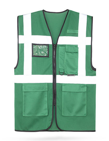 Multifunktionale Mesh Warnweste mit Reißverschluss und Taschen | Auch bei hohen Temperaturen komfortabel durch Mesh-Gewebe und lockerer Passform | Zwei je 5 cm breite Reflexstreifen um den Körper und über den Schultern für eine gute Sichtbarkeit | Ausgestattet mit diversen Taschen sowie einem D-Ring | Zertifiziert nach EN ISO 20471