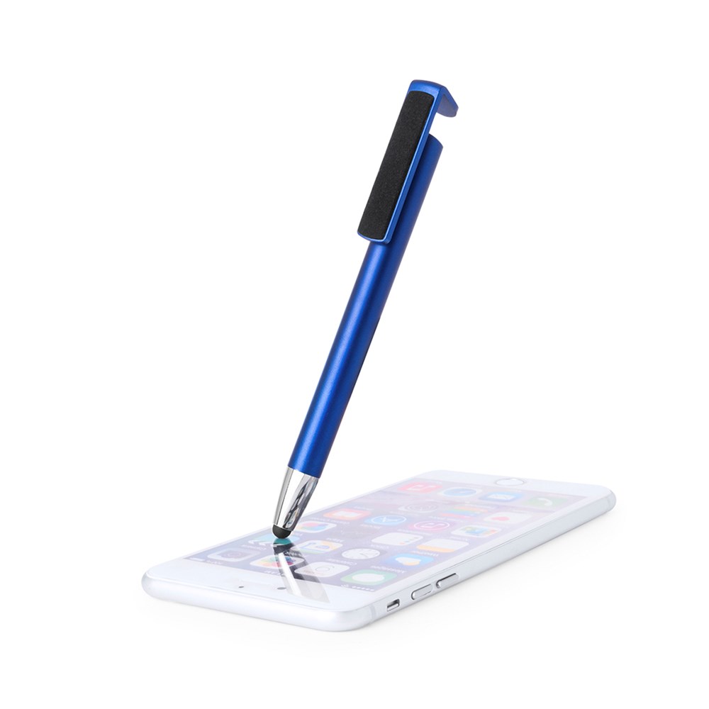 Multifunktioneller Druck-Kugelschreiber in kräftigen Farben mit speziellem Clip mit doppelter Funktion: Ständer für Mobilgeräte und Bildschirmreiniger. Mit Metallschaft - speziell entwickelt für den Tampondruck. Schwarze Tinte.