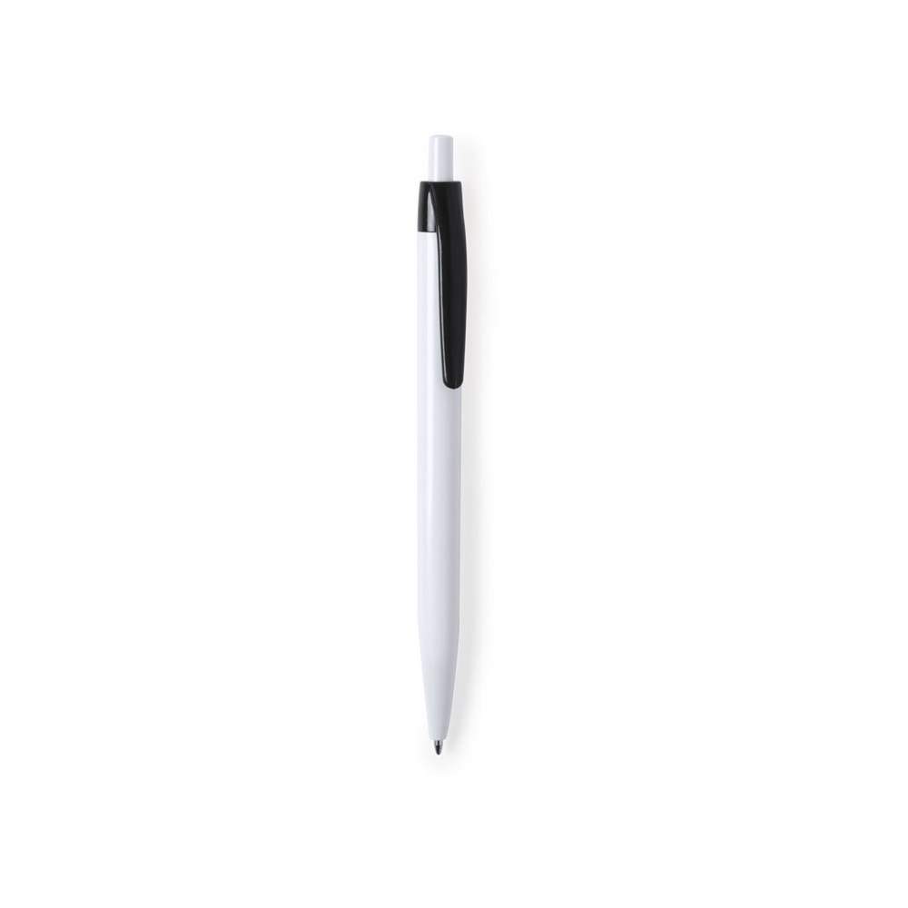 Kugelschreiber mit Push-up-Mechanismus in auffälligem, zweifarbigem Design. Gehäuse in weißer Farbe und Clip in verschieden breiten Farben. Großer Druckbereich und blaue Tintenmine.