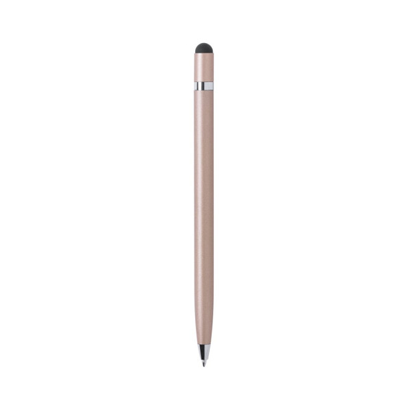 Dreh-Kugelschreiber mit Stylus aus Aluminium mit geschmeidigem Metallic-Finish und verchromtem Ring. Erhältlich in Gold, Rosa und Silber in glänzender Ausführung sowie Weiß in matter Ausführung. Blaue Tinte.