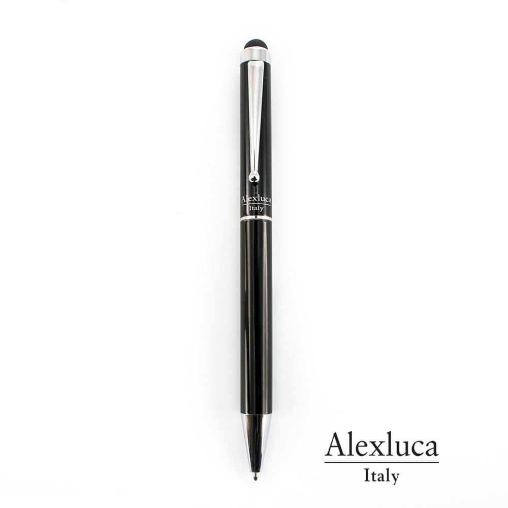 Dreh-Kugelschreiber mit Stylus von Alexluca. Mit angenehm weichem Metallschaft in elegantem Schwarz. Clip und Spitze in passender Farbe. Präsentiert in einem individuellen schwarzem Etui mit Markenlogo. Blaue Tinte.