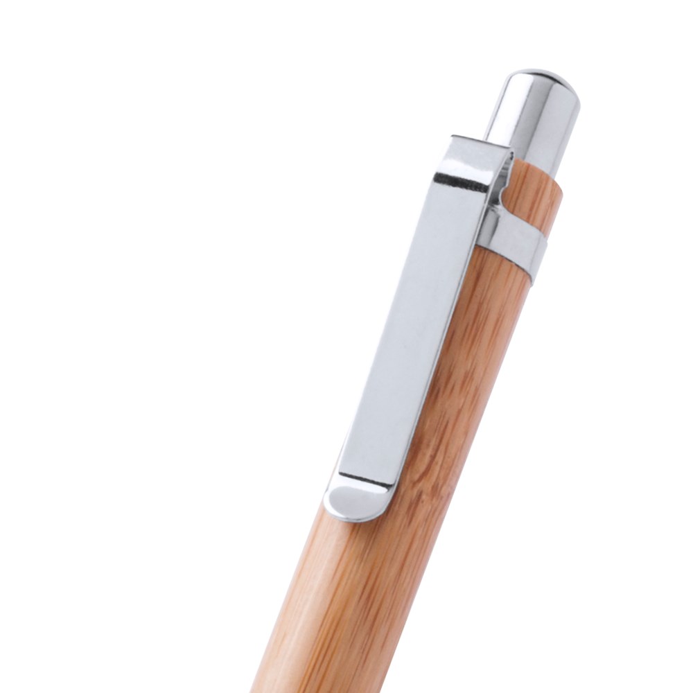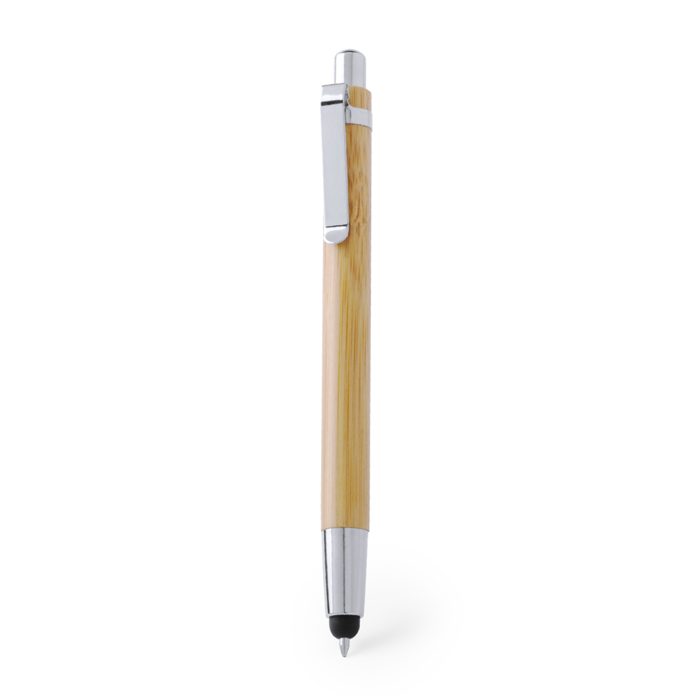 Eleganter Druck-Kugelschreiber mit Stylus und Schaft aus natürlichem Bambusholz mit Kontrastdetails in glänzendem Silber-Metallic. Jumbo-Patrone mit blauer Tinte.