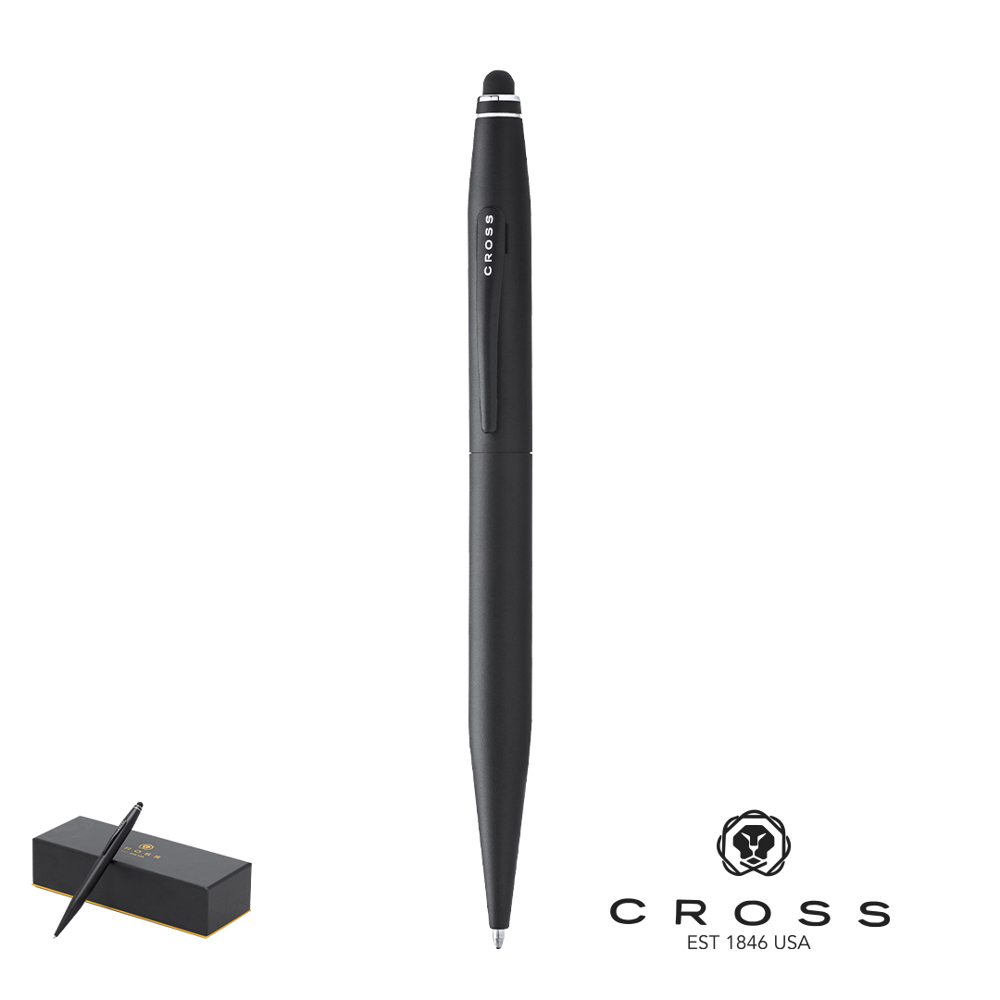 Druck-Kugelschreiber mit Stylus von Cross - Modell Tech 2. Mit klassischem, zweifarbigem Design, geschmeidigem Metallgehäuse in verschiedenen Farben und originellem Clip in Schwarz. Präsentiert in einer individuellen, eleganten Schachtel in Schwarz mit dem Markenlogo, sowie Wildleder-Interieur in passender Farbe. Schwarze Tinte.