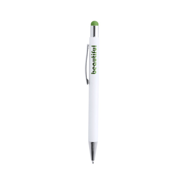 Druck-Kugelschreiber mit Stylus aus Aluminium in einem eleganten, matten Weiß. Mit Stylus in einer Vielzahl von Farben - farblich passend zum Interieur - und verchromten Kontrastdetails. Mit Außenbeschichtung, die speziell für die Lasermarkierung entwickelt wurde, so dass Ihr Logo in der Farbe des Interieurs graviert wird. Jumbo-Patrone mit blauer Tinte.
