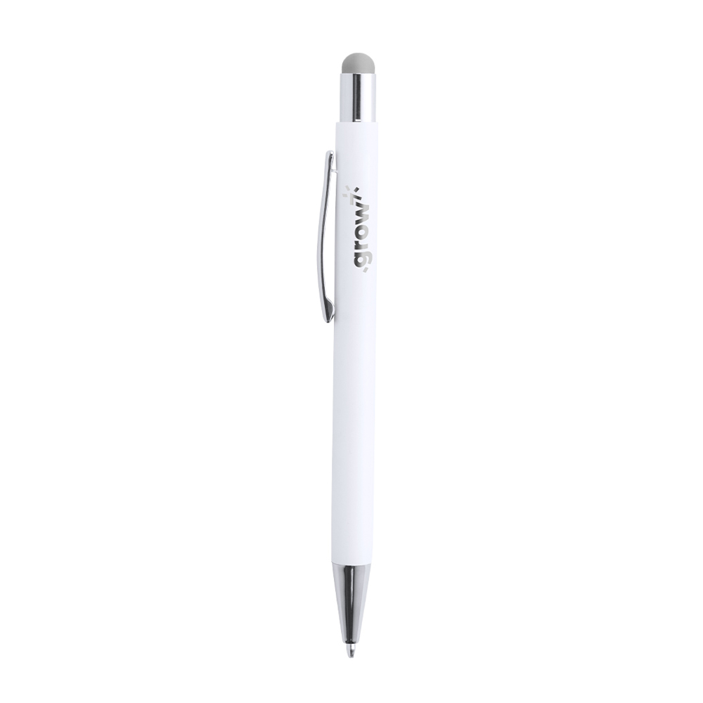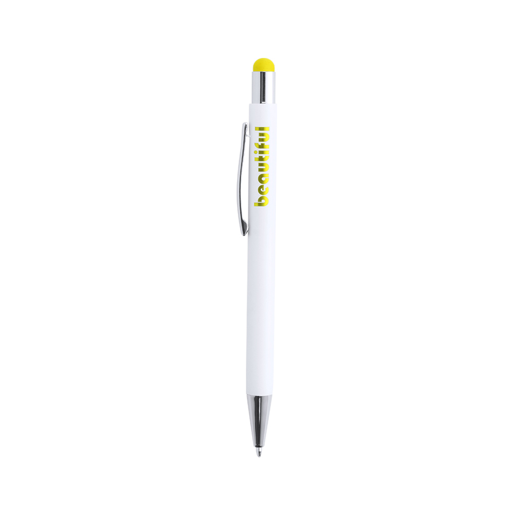 Druck-Kugelschreiber mit Stylus aus Aluminium in einem eleganten, matten Weiß. Mit Stylus in einer Vielzahl von Farben - farblich passend zum Interieur - und verchromten Kontrastdetails. Mit Außenbeschichtung, die speziell für die Lasermarkierung entwickelt wurde, so dass Ihr Logo in der Farbe des Interieurs graviert wird. Jumbo-Patrone mit blauer Tinte.
