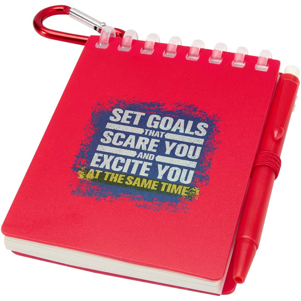 Das Lig Mini Notizbuch und Stiftset ist ein kompakter und praktischer Begleiter für Notizen unterwegs. Das spiralgebundene Notizbuch verfügt über einen weichen Einband aus recyceltem Kunststoff sowie 70 leere Seiten aus 120 g/m² wasserfestem Steinpapier und ist somit ideal für die Verwendung im Freien geeignet. Mit seinen abgerundeten Ecken und der integrierten Stifthalterung folgt es dem Trend zu Mini Formaten und bleibt dabei funktional. Der passende Kugelschreiber besteht aus recyceltem ABS Kunststoff, schreibt mit schwarzer Tinte und hat eine Schreiblänge von 250 Metern. Ein farblich abgestimmter Metallring ermöglicht die einfache Befestigung des Sets an einem Rucksack, einer Handtasche oder einem Schlüsselbund. Somit eignet es sich perfekt für Notizen unterwegs. Notizbuchformat: 11 × 7,5 cm.