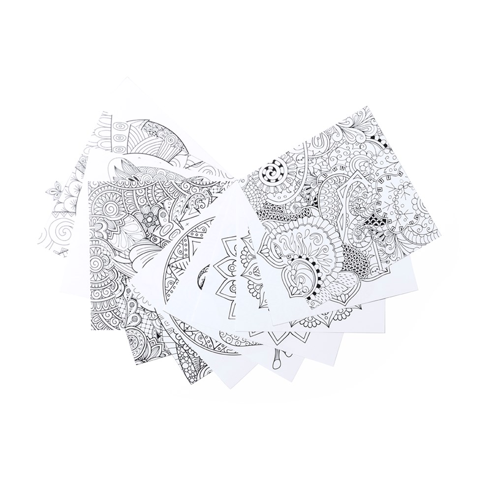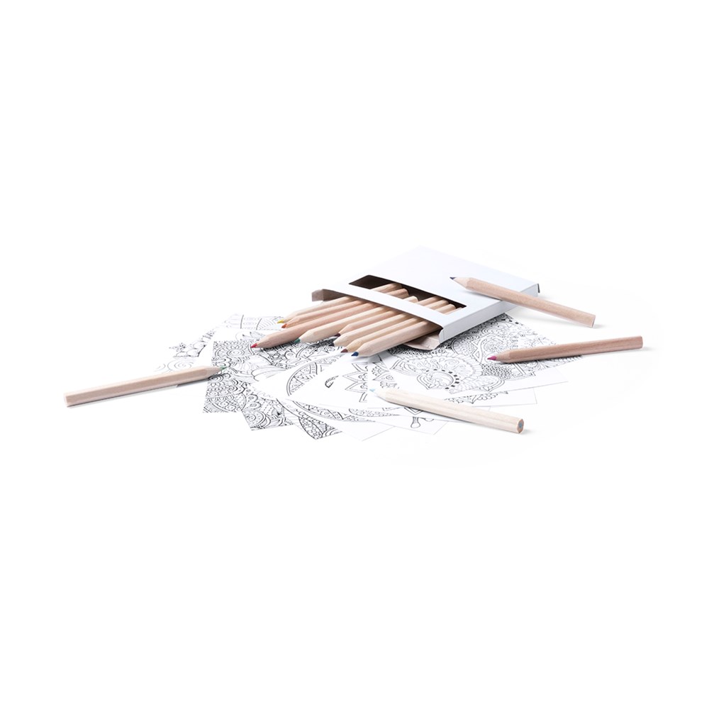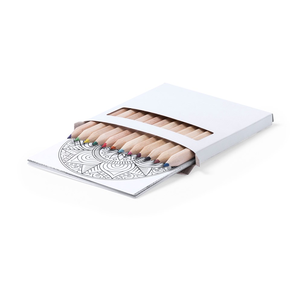 Set aus Buntstiften und Ausmalbildern mit Mandala-Designs - perfekt zum Entspannen. Enthält 12 sechseckige Buntstifte und 12 Ausmalbilder mit verschiedenen Designs. Präsentiert in einer Kartonschachtel mit Fenster.