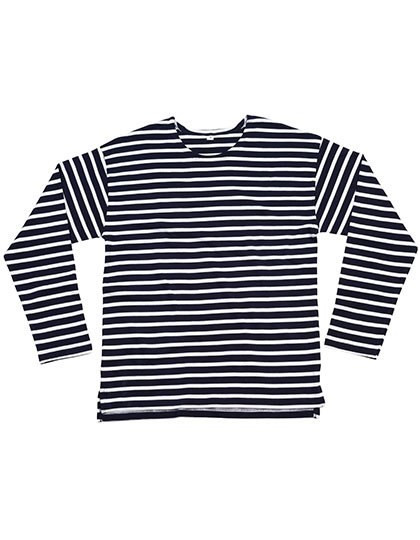 Zertifizierung als Bio-Baumwolle in Arbeit | Unisex | Überschnittene Schultern | 0,8 und 1,6 cm breite, garngefärbte Streifen | Seitenschlitze | Länger geschnittener Rücken | Weiche und dehnbare Qualität | Abreißetikett