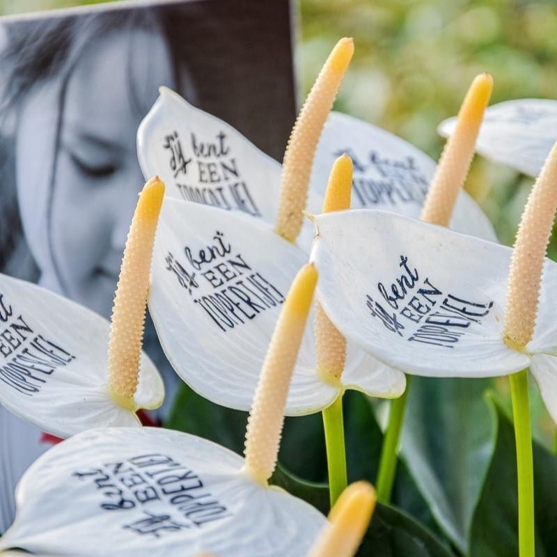 Veredelung Infotext: Einfarbiger Druck auf der Blume in einer Standardfarbe: schwarz, blau, grün, rot, rosa, gelb, lila, orange, gold, silber. Dank spezieller Techniken hat dies keinen Einfluss auf die Lebensdauer der Blume. Solange die Blume gesund ist und gut gepflegt wird, bleibt der Druck deutlich sichtbar, ohne zu verblassen. Dies bedeutet, dass Ihr Druck langfristig sichtbar bleibt.