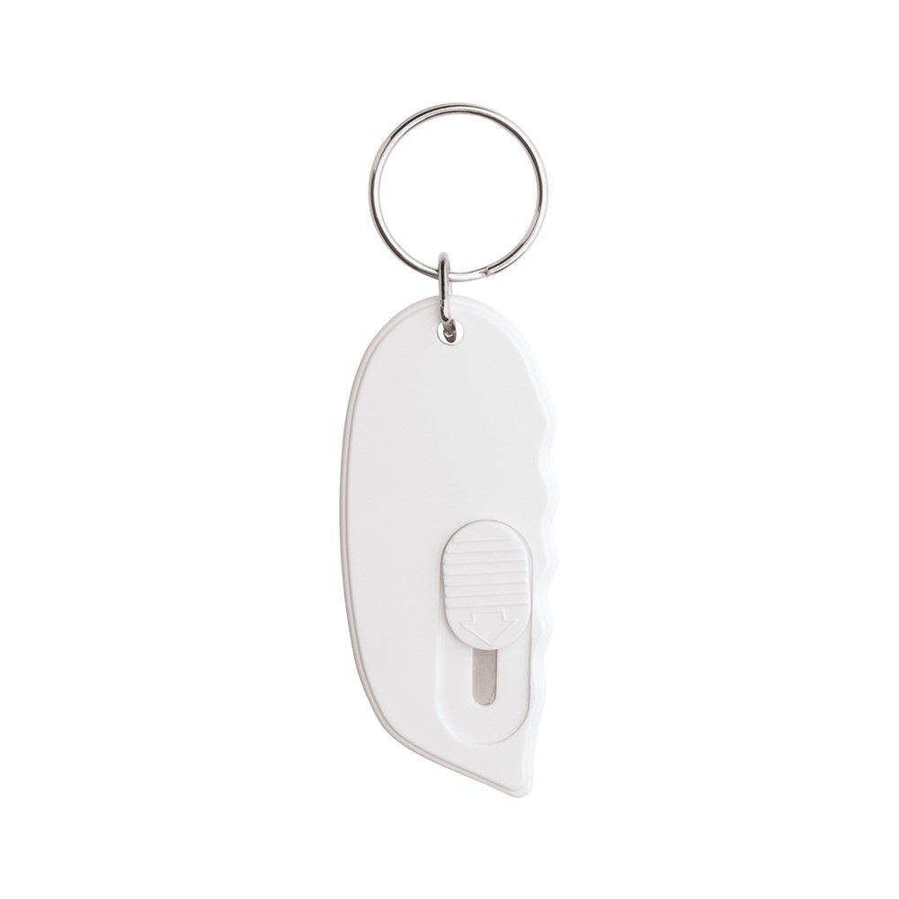 Ein ideales Werbe-Gadget mit toller Cutter-Funktion: Die Klinge lässt sich über einen Schieberegler herausschieben. Die Rückseite des Cutter-Schlüsselanhängers kann vollflächig im UV-Druck veredelt werden. Alternativ als Veredelung wählbar ist ein ein- bis zweifarbiger Tampondruck.